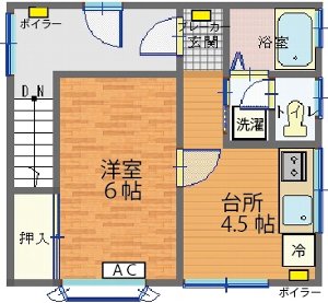 | 間取り内訳 | 洋6、台所4.5帖 | エアコン | 1台付(洋6) |